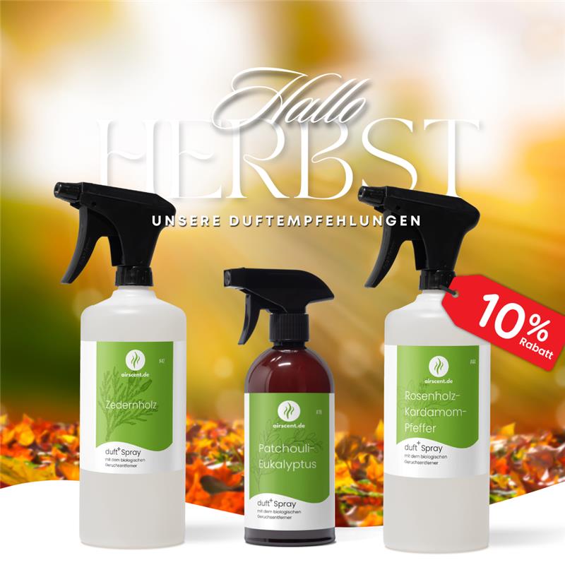 Die Tage werden kürzer, die Luft wird frischer und warme Farben ziehen in die Natur ein – jetzt ist die ideale Zeit für unsere stimmungsvollen Herbstdüfte. Sie bringen Gemütlichkeit, Wärme und Behaglichkeit in Ihre Räume und machen jeden Moment noch schöner. Der speziell entwickelte airscent Geruchsvernichter neutralisiert dabei innerhalb weniger Minuten unangenehme Gerüche – für ein wohliges Herbstgefühl mit klarer Frische.