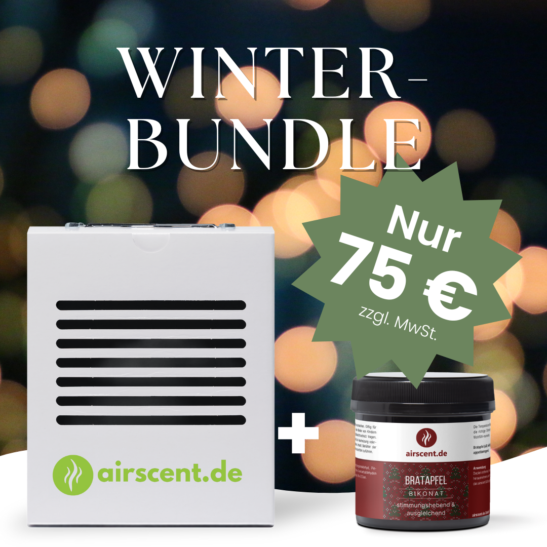 Die Tage werden kälter, draußen glitzert der Frost und drinnen wächst die Sehnsucht nach Wärme und Geborgenheit – jetzt ist die perfekte Zeit für unsere wohltuenden Winterdüfte. Sie schaffen eine Atmosphäre voller Ruhe, Behaglichkeit und festlicher Stimmung und verwandeln jeden Raum in einen Ort zum Wohlfühlen. Im Winter-Bundle entahlten ist unser nachhaltiges Duftgerät Eco inkl. 200g Bikonat. Das Eco besteht aus Wellpappe (spezielle Beschichtung) und ist auf ein Minimum an technischen Bauteilen reduziert. Unser Eco ermöglicht eine gesundheitsfreundliche Beduftung ohne Mikrotröpfchen, Verkeimung und Alkohol. Das Eco kann mit 200 g (bis 30 m²) oder 500 g (bis 70 m²) Bikonat befüllt werden.
