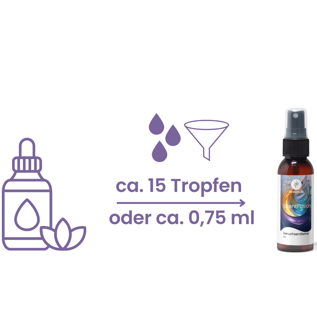 Für eine wirkungsvolle Beduftung geben Sie auf 50 ml ScentFusion Geruchsentferner ca. 15 Tropfen oder 0,75 ml ätherisches Öl Ihrer Wahl hinzu. Oder nach Belieben.